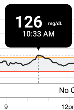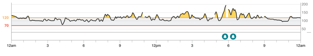 This is the smoother sailing, a gradual rise from a 10am meal, a spike under 130mg/dL and a gradual return to baseline: